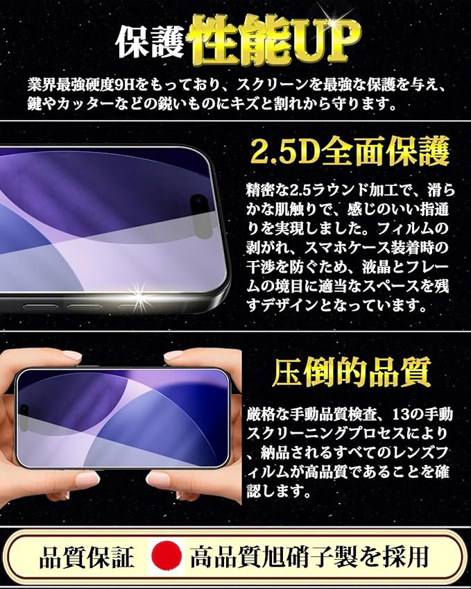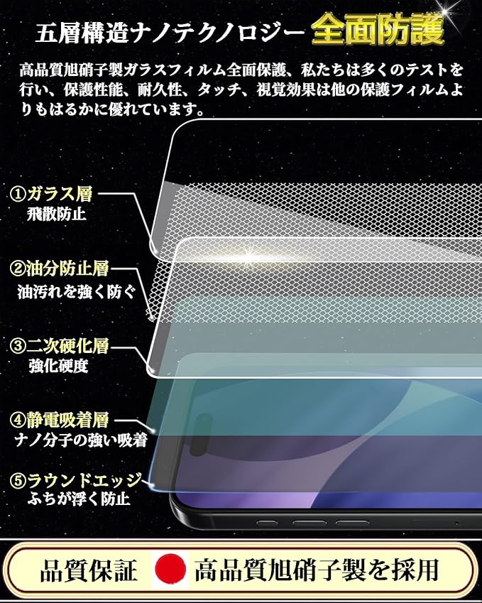 【旭硝子素材採用】日本製素材旭硝子製を採用しております、高品質な素材で衝撃を緩和し画面の破損を最低限まで抑えます。高品質製品の製作プロセスに厳しく基づき、ガラス420 高温強化時間6時間、め七つのステップを経てスマホに完璧的にフィットした製品を製造されます。