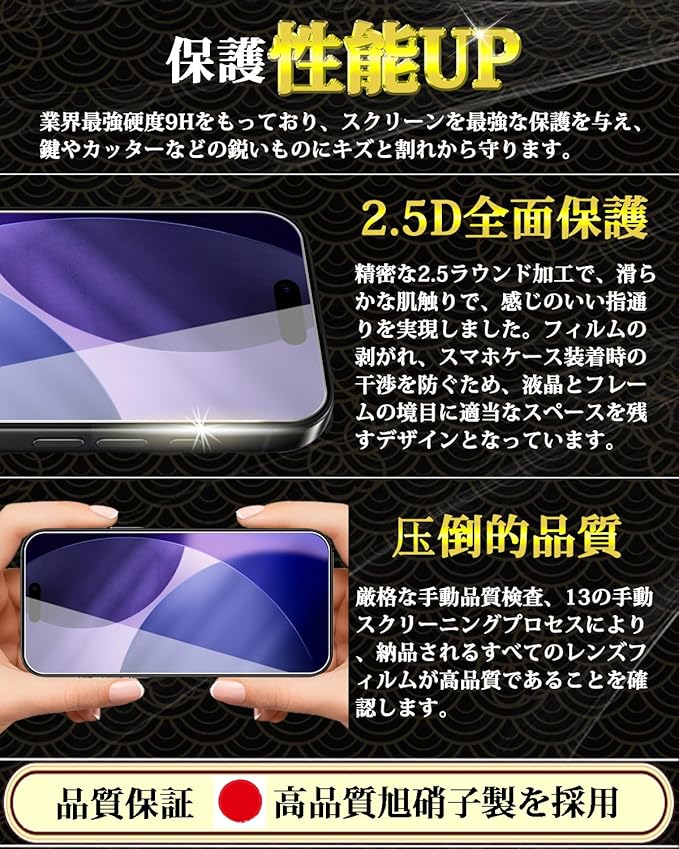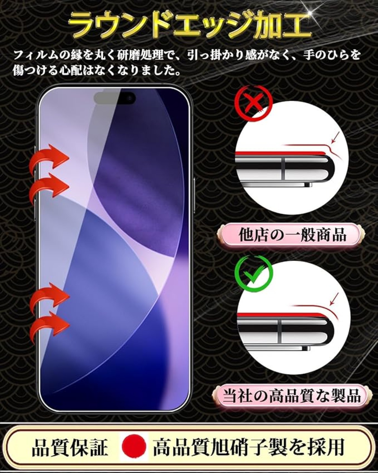 特徴 9H表面硬度,飛散防止,防指紋,撥油コーティング,撥水剤,耐衝撃性,ラウンドエッジ,気泡なし,高透過率,簡単貼り付け