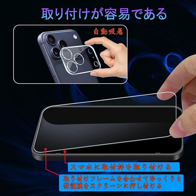 【貼付け簡単・専用ガイド枠付き】専用の貼り付けガイド枠が同梱されています。ガイド枠を利用することで、初心者でも簡単に貼り付けます。すべての失敗の発生を防ぐことができて、ご心配を完全に解消します!グレードアップしたイオン自働吸着技術を採用して、初心者でもたった3ステップ、10秒で簡単に綺麗で貼り付けることができます。