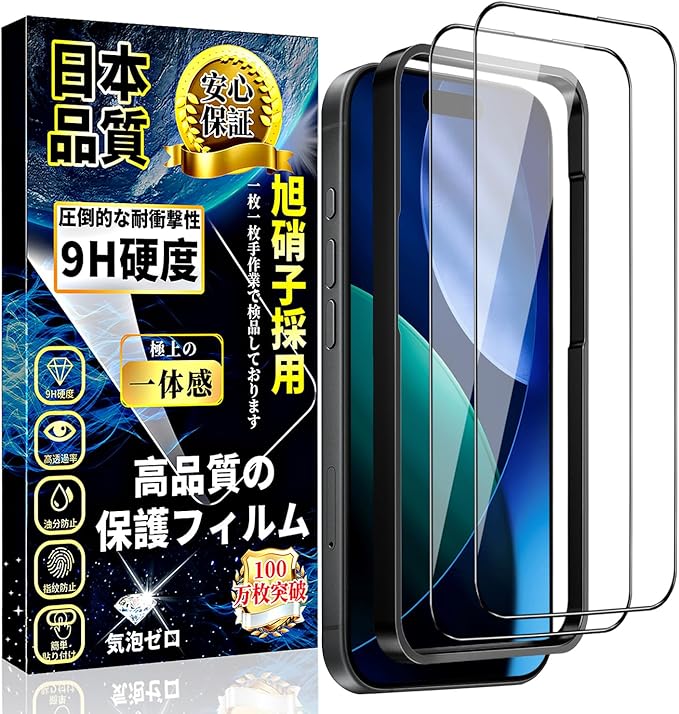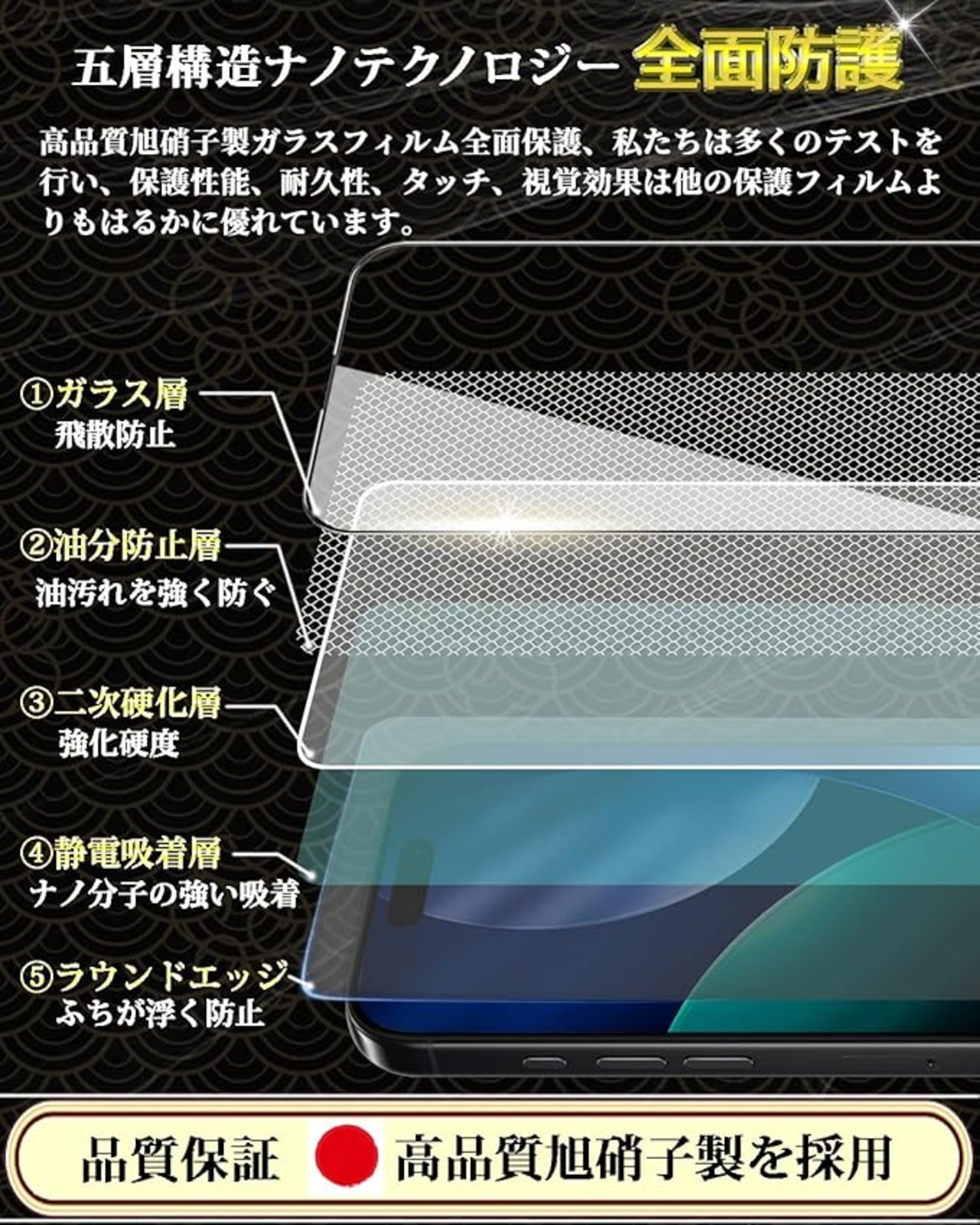 特徴 全面保護,9H表面硬度,飛散防止,防指紋,撥油コーティング,撥水剤,耐衝撃性,ラウンドエッジ,気泡なし,高透過率,簡単貼り付け