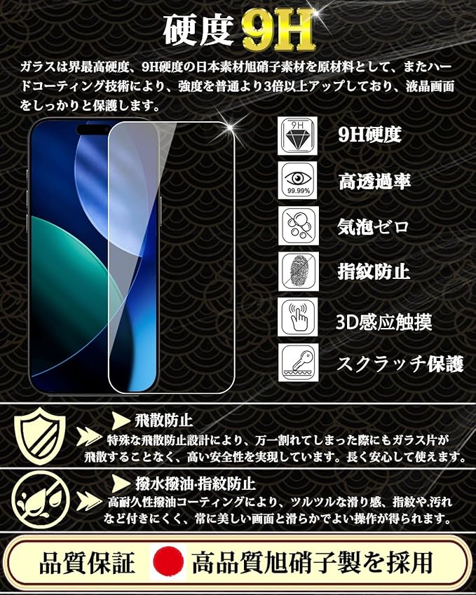特徴 9H表面硬度,飛散防止,防指紋,撥油コーティング,撥水剤,耐衝撃性,ラウンドエッジ,気泡なし,高透過率,簡単貼り付け