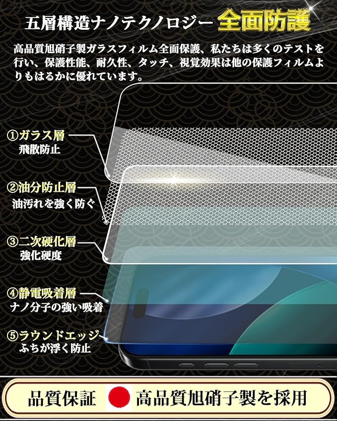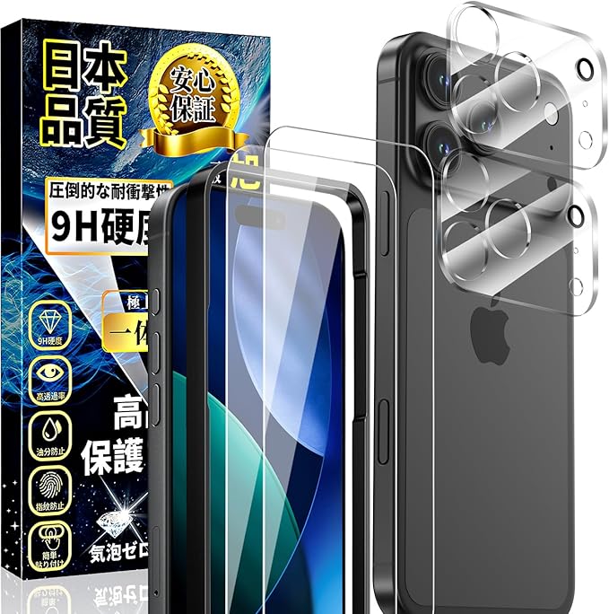【旭硝子素材採用!対応機種】iPhone 17 Pro Max 2枚ガラスフィルム+2枚カメラフィルム は日本製の旭硝子を素材として採用し、業界最高レベルの9H硬度を持ち、耐衝撃性と耐傷性に優れています。衝撃吸収の特性により、転落とかの外力からスマホ画面への衝撃ダメージを最小限に抑えることができます。