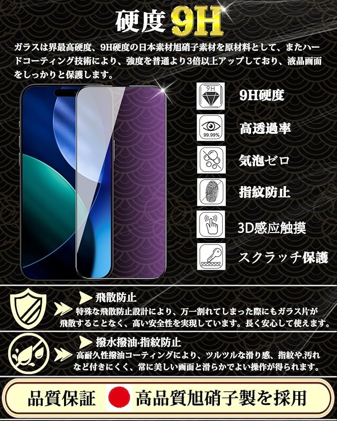 特徴 ブルーライトカット,9H表面硬度,飛散防止,防指紋,撥油コーティング,撥水剤,耐衝撃性,ラウンドエッジ,気泡なし,高透過率,簡単貼り付け