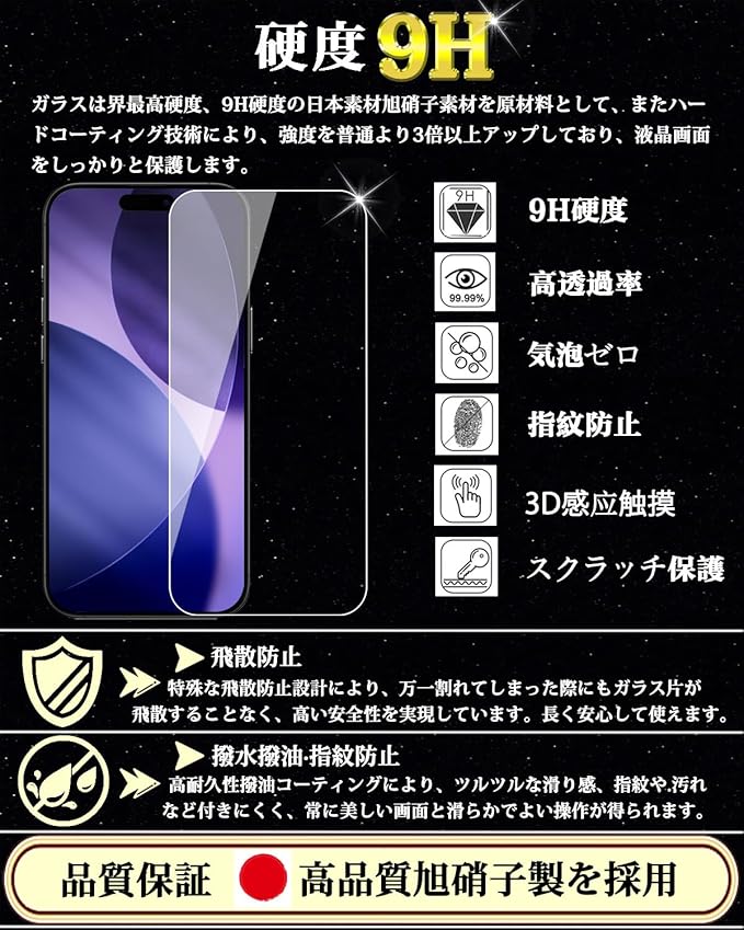 特徴 9H表面硬度,飛散防止,防指紋,撥油コーティング,撥水剤,耐衝撃性,ラウンドエッジ,気泡なし,高透過率,簡単貼り付け