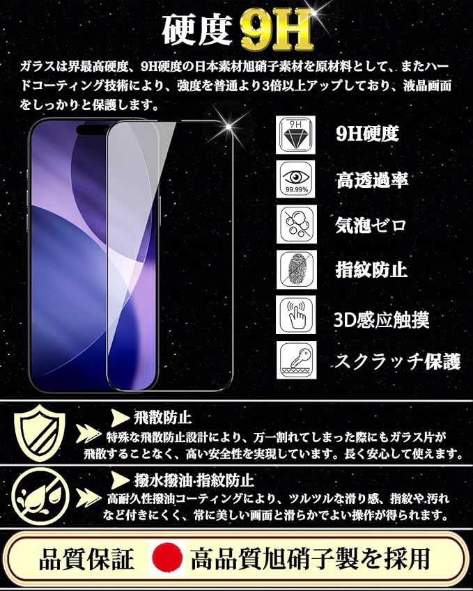 特徴 全面保護,9H表面硬度,飛散防止,防指紋,撥油コーティング,撥水剤,耐衝撃性,ラウンドエッジ,気泡なし,高透過率,簡単貼り付け