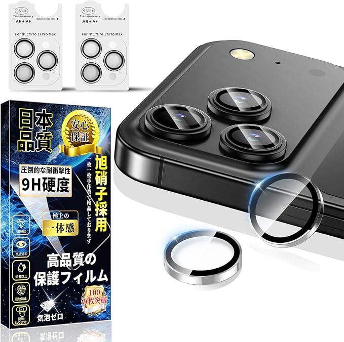 【専用設計!対応機種】iPhone 17 Pro / 17 Pro Max 専用 カメラフィルム 露出オーバー防止。精密加工により、透明なアクリルリングとガラスで、レンズに溶け込むような一体感。カメラ保護フィルムは、貼り付けてもカメラレンズより0.26mmほどしか高くならないため、カメラレンズそのままで使っているような自然なデザインです。
