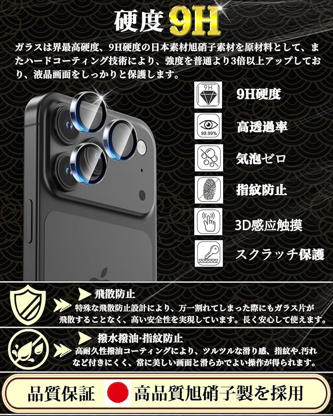 特徴 全面保護,9H表面硬度,飛散防止,防指紋,撥油コーティング,撥水剤,耐衝撃性,ラウンドエッジ,気泡なし,高透過率,簡単貼り付け
