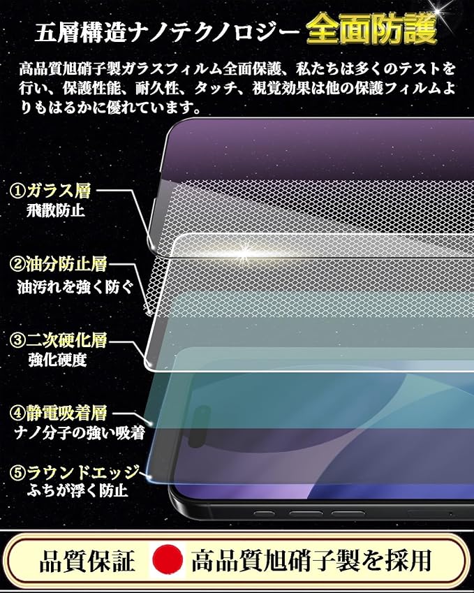 特徴 ブルーライトカット,9H表面硬度,飛散防止,防指紋,撥油コーティング,撥水剤,耐衝撃性,ラウンドエッジ,気泡なし,高透過率,簡単貼り付け