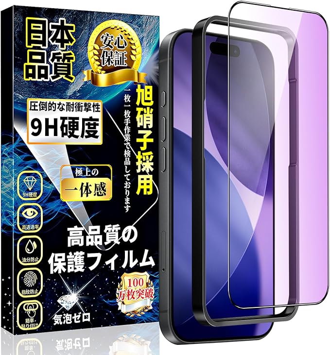 【旭硝子素材採用!対応機種】iPhone 17 Pro ブルーライトカット ガラスフィルム。日本製最上級旭硝子ガラスを使用しております、業界最高レベルの9H硬度、ハードコーティング技術により外部からの衝撃をフィルムが吸収し、ナイフや鍵などの尖ったものでも簡単には傷がつかなく、最高程度で画面を守ります。