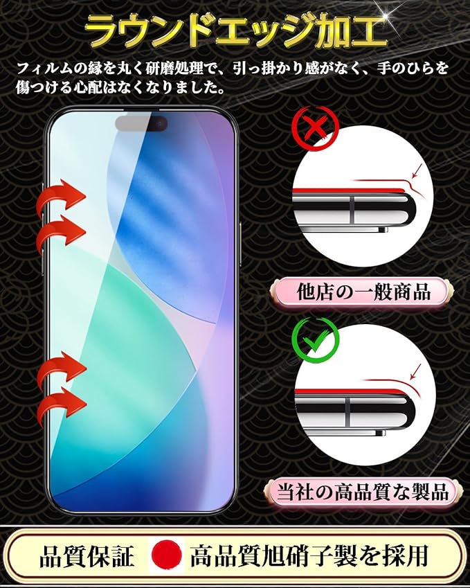 特徴 ブルーライトカット,9H表面硬度,飛散防止,防指紋,撥油コーティング,撥水剤,耐衝撃性,ラウンドエッジ,気泡なし,高透過率,簡単貼り付け