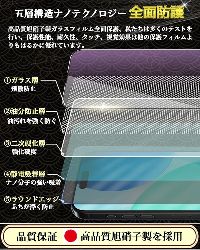 【気泡ゼロ・貼付け簡単】気泡防止加工が施されているので、気泡が入りにくい。万が一気泡が入ってしまっても時間が経てば徐々に抜けるので 美しい仕上がりに。自動吸着機能あり、ガラスを液晶画面スクリーンに軽く押すだけで自然に画面に吸着できます。初心者やフィルム貼りが苦手の方にも安心です。