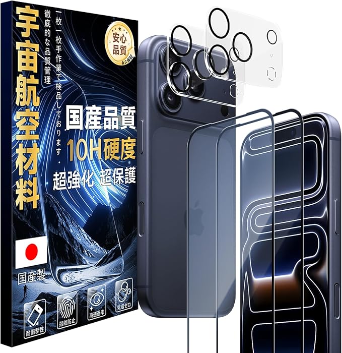 対応 iPhone 17 Pro Max ガラスフィルム 2枚+レンズ保護 2枚セット 10H硬度・米軍規格航空材料 超高清透明 指紋防止 撥水撥油 感圧式タッチ対応JCMIP17PM22
