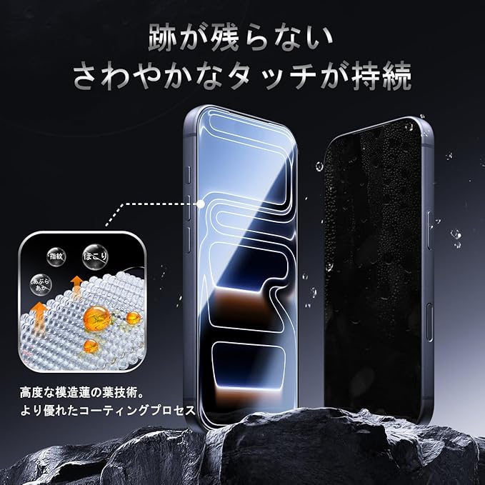 【三次元防汚システム】三重撥コート層構造-①指紋防止層 ②油汚れバリア ③水玉効果コート の複合加工で、コーヒー飛沫・雨粒・皮脂汚れを瞬時にはじく。