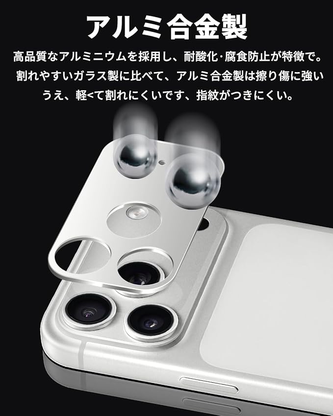 【アルミ合金一体感】アルミ合金素材を採用して、ガラス製カメラフィルムより軽い上に割れることもなく、指紋も付きにくいです。さらにアルマイト処理が施されているので、耐摩耗性にも優れています。縁部分も含め、精確なサイズにカービングされているので引っかかる感じがなく、ほとんどのケースとも干渉しません。 本体のレンズ部分と完全に融合し、違和感がなく、一体感と高級感に満ちています。