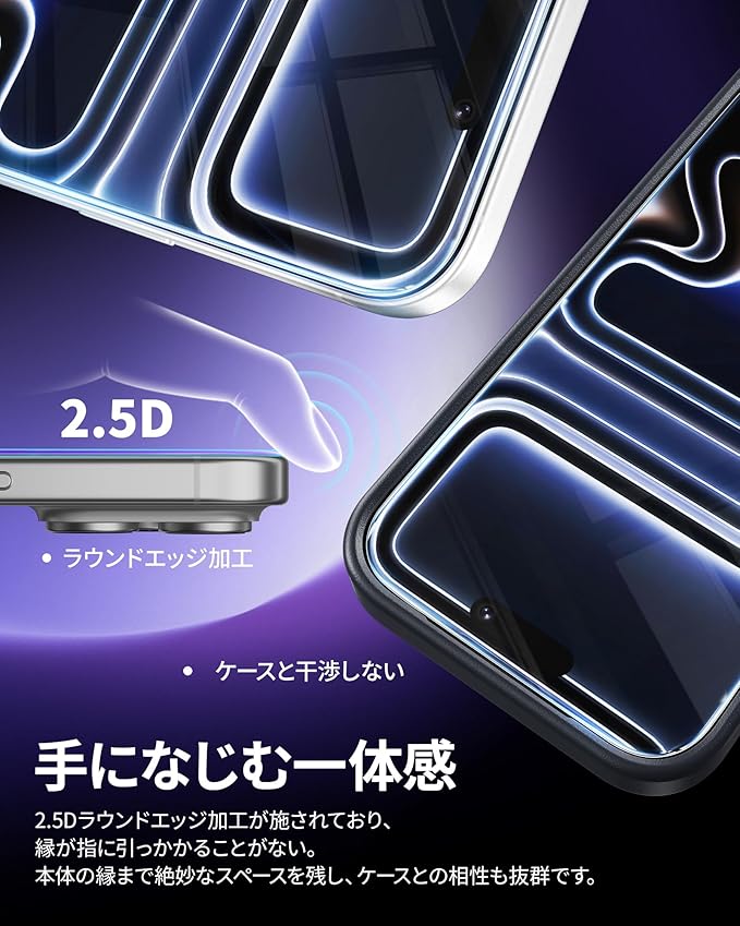 「2.5Dラウンドエッジ加工・ケースとの相性抜群」2.5Dラウンドエッジ加工が施されており、手に引っかかる感じがありません。本体の縁まで適度なスペースを残しており、装着後もスマホのデザインを損なわず、ケースとの相性も抜群です。