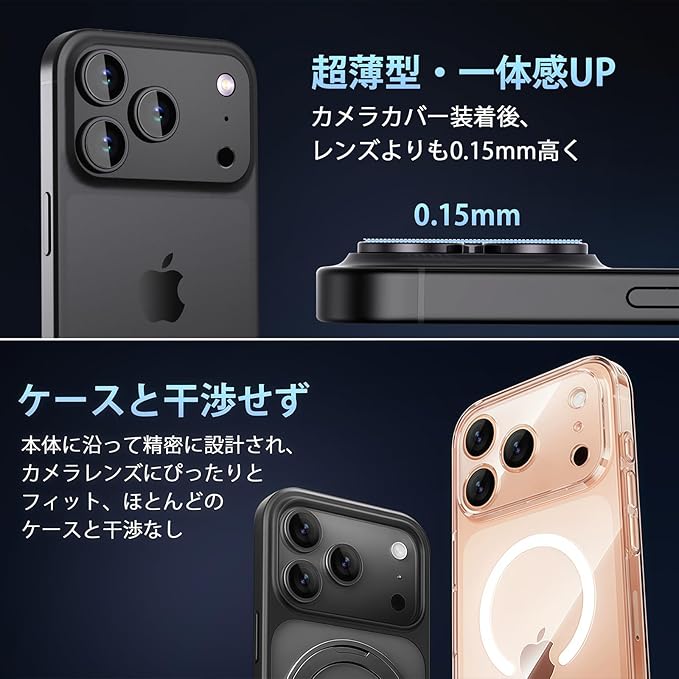 【対応機種】 iPhone17Pro専用カメラ保護カバーで、カメラレンズを全面保護します。独自技術により、レンズとプレートが純正一体の設計で隙間がなく、密着性が高くて埃が入れない、空気も霧もなく、眩しさもない。レンズは脱落することがありません。