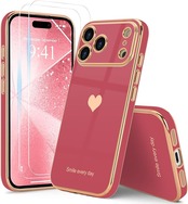Teageo iPhone 17 Pro 用 ケース 【1枚ケース+2枚ガラスフィルム】 全面保護 女の子 可愛い おしゃれ ハート スマホケース 薄型 耐衝撃 落下防止 メッキ加工 アイフォン 17 Pro 適用 保護カバー(カメリアレッド)