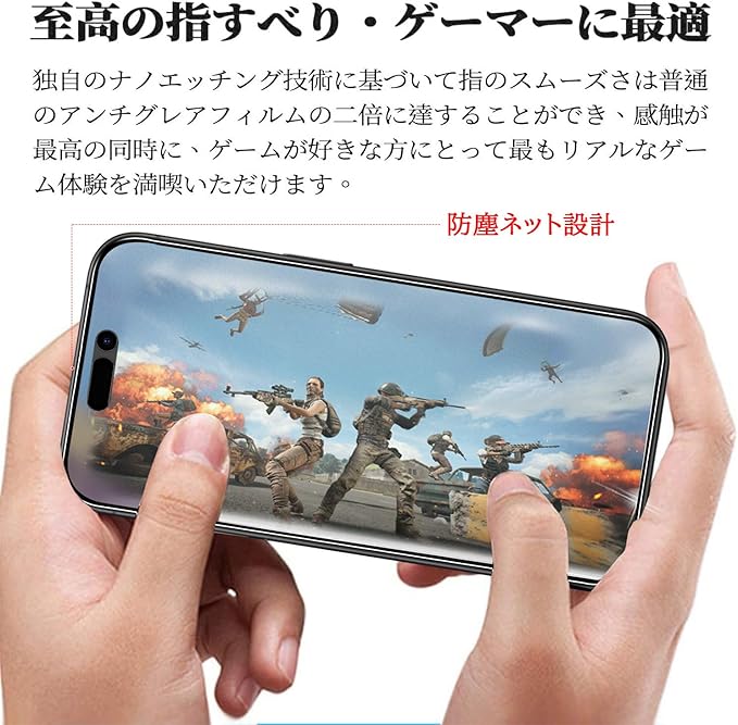 【スクラブ加工、サラサラ手触り、指紋防止】特殊加工のスクラブ保護フィルムは、指紋が目立ちにくくなって、油分や水分にも強く付着した水滴や汗、化粧品等簡単に拭き取ることが可能です。いつも美しくて清潔にご愛機を守るフィルムです。新開発版、 独自のナノエッチング技術に基づいて指のスムーズさは普通のアンチグレアフィルムの二倍に達することができ、感触が最高の同時に、ゲームが好きな方にとって最もリアルなゲーム体験を満喫いただけます。