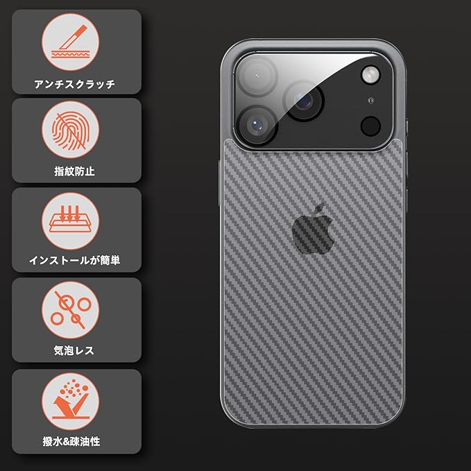 【対応機種】iPhone 17 Pro 対応 炭素繊維素材フィルムです。【パッケージ内容】背面フィルム*2枚 / カメラフィルム*2枚、クリーニングキット*2枚、スクラッチカード*1枚。ご注文する内容と異なる商品が届いた場合や、不良品・破損がある場合、メールでご連絡ください。弊社は無料交換で対応いたします。ご連絡の手順:アカウントサービス内の「アカウントサービス」→「注文履歴」→「この注文について問い合わせる」から、お気軽にお問合せ下さい。