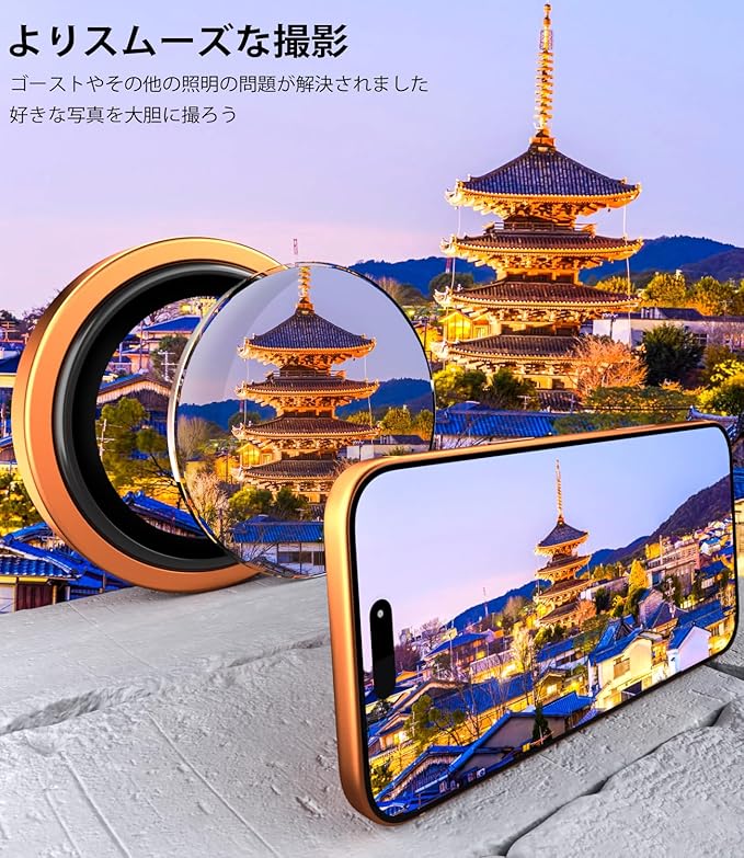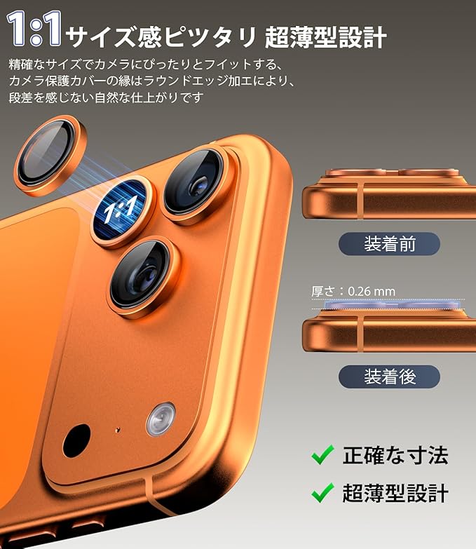 【本来の色再現、精密なカバー力】 PVDコーティング技術を採用し、iPhone 17 Pro / 17 Pro Maxのカメラ部分本来の色と質感を完璧に再現。本来の光沢と高級感を保ち、シームレスな視覚体験を提供します。新型iPhone 2025のレンズ形状にぴったり合うよう精密に成形されているため、美しい外観でありながら目立ちにくく、セルフィーや写真撮影をプレミアムな雰囲気に演出します。