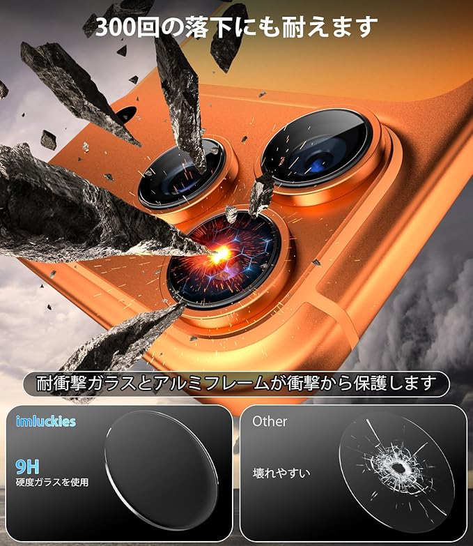 【9H高硬度ガラス】imluckies 高硬度強化ガラスを採用し、優れた耐衝撃性を発揮。落下や持ち運び時の衝撃からカメラを効果的に保護します。9H以上の硬度で、鍵やバッテリーなどの硬い物に擦れても傷がつきにくくなっています。