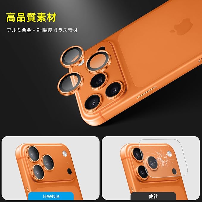 iPhone 17 Pro/iPhone 17 Pro Max 5G 対応 カメラフィルム アルミ合金+9Hガラス素材 レンズフィルム 露出オーバー防止 傷防止 用 アイフォン 17 Pro/Pro Maxカメラ保護 スクリーンプロテクター カメラレンズ保護フィルム - オレンジ