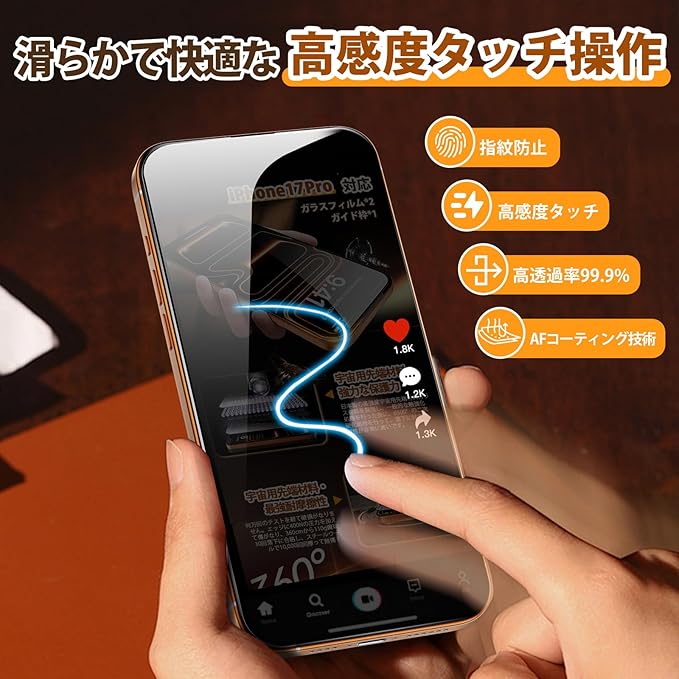 【画期的な技術・99.9%ブルーライトカット】ガラスフィルム基材にブルーライト防止因子を加え、有害なブルーライトを吸収することでブルーライトを遮断し、持続的なブルーライトによる目へのダメージを軽減します。また、iPhone 17Pro フィルムにドイツで開発されたARコーティングを施し、有害なブルーライトを反射させます。「吸収」+「反射」の2つのカット方式で99.9%ブルーライトカットを実現しました。