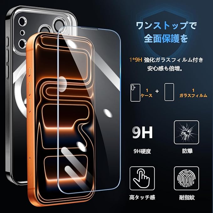 iPhone 17 Pro 専用 ケース カバー クリア 1枚ガラスフィルム付き TPU MagSafe対応 ワイヤレス充電対応 マグネット搭載 耐衝撃 アイフォン17pro カバー 自動吸着 高透過率 全面保護 指紋防止(ブラック)