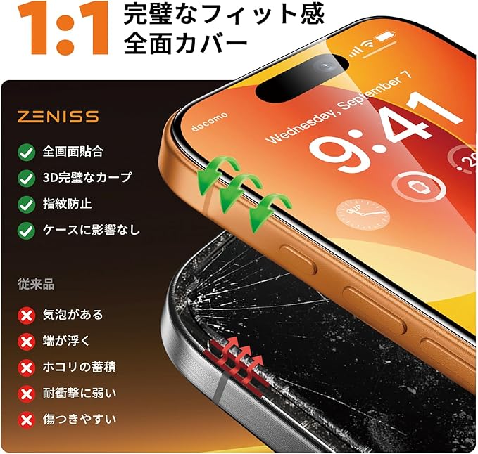 【世界初iphone 17 pro ガラスフィルム 失敗ゼロ・気泡ゼロ・ズレゼロ】iphone17pro フィルム貼り時の位置ずれによる繰り返しの調整、気泡、埃やゴミの残留、割れやすさ、キズつき…などのお悩み?これらの問題を解決するため、画期的なホコリ除去ガイド枠 アイフォン17 pro ガラスフィルムを開発しました。「自動位置合わせ+自動吸塵」の革新技術を搭載し、呼吸のように簡単:置くだけでスマホが正確に位置合わせされ隙なし、引くだけでで除塵ストリップが自動的にゴミを吸着し完璧に密着。手動での位置合わせ、繰り返しのはがし貼りや頑固な気泡に完全に別れを告げましょう!初心者でもプロ級の仕上がりが簡単に実現。煩雑な操作から解放され、貼り成功率UP。または使用に関するご質問がございましたら、いつでもご連絡ください。Zenissは24時間365日の技術サポートを提供し、お客様に安心してお使いいただけるよう、問題解決に尽力してまいります。