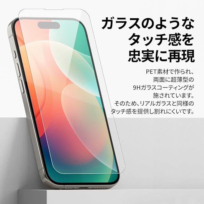 【ガラスのようなタッチと感触】 DIACUBEの超薄型9Hガラスライクフィルムは、単なる一般的な強化ガラスではありません。PET素材に両面ガラスコーティングを施し、さらに最上部に指紋防止コーティングを施しているため、ガラスと非常に似たタッチ感を感じることができます。