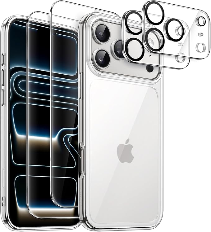 JETech 5 in 1 iPhone 17 Pro 6.3インチ用 ケース 2枚強化ガラスフィルム+2枚カメラレンズフィルム付き 黄ばまない 耐衝撃バンパースマホカバー (クリア)