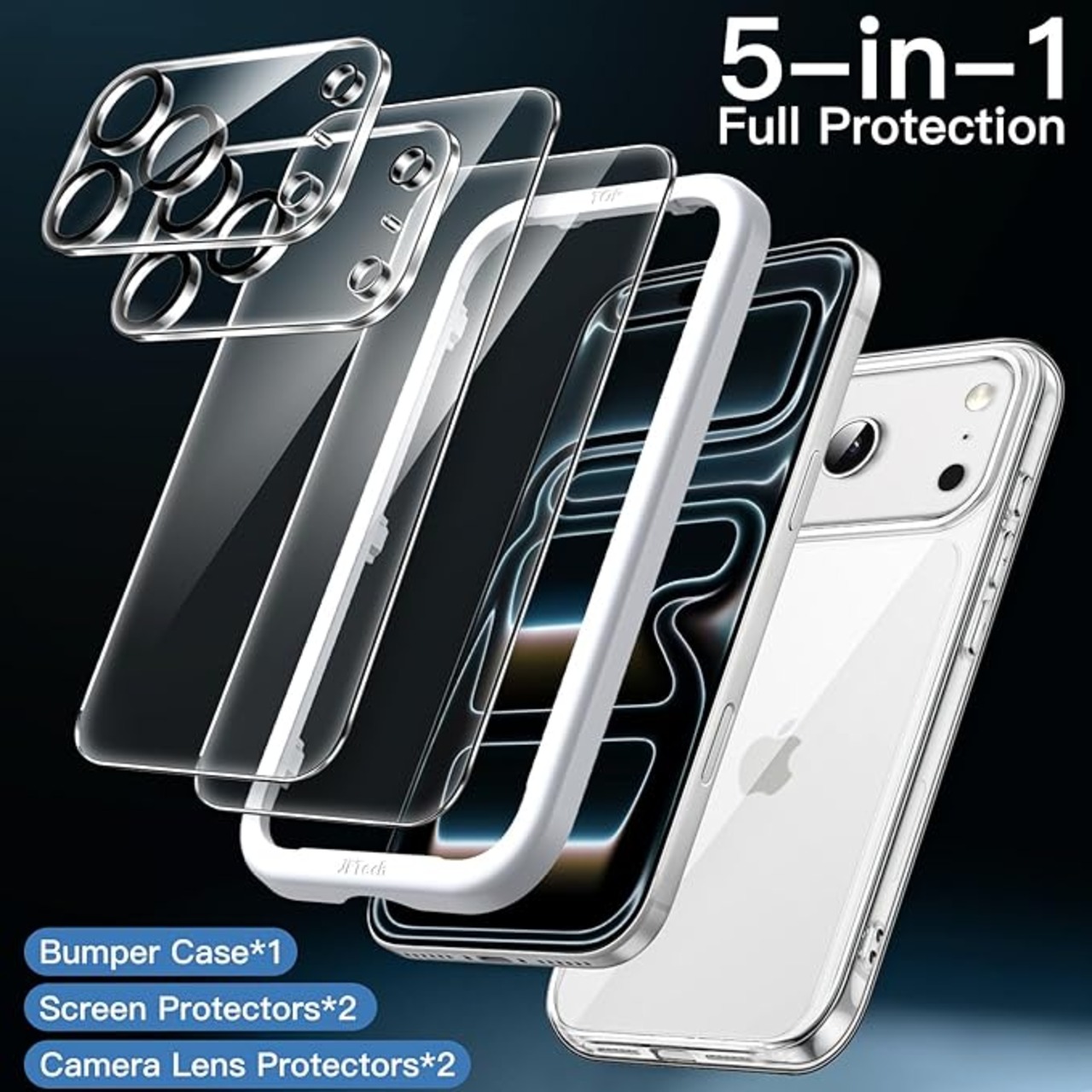 JETech 5 in 1 iPhone 17 Pro Max 6.9インチ用 ケース 2枚強化ガラスフィルム+2枚カメラレンズフィルム付き 黄ばまない 耐衝撃バンパースマホカバー (クリア)