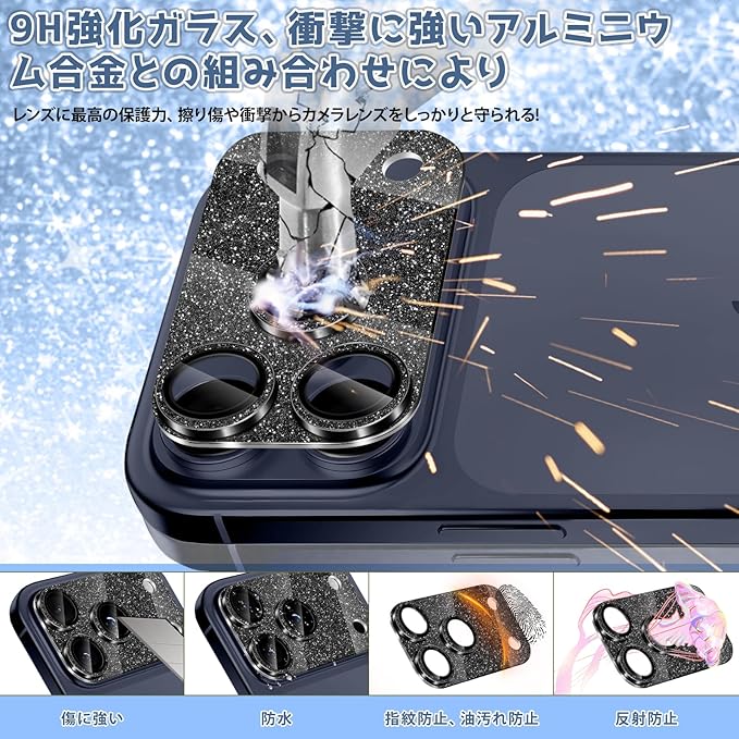 [ShinKin] iPhone 17 Pro 対応 カメラフィルム カメラ保護カバー カメラカバー キラキラ アルミニウム合金 レンズカバー カメラ保護 [アルミ合金縁取り+強化ガラス] キラキラ レンズ保護フィルム 高透過率 露出オーバー防止 キズ防止 全体保護 ファッション ユニーク iPhone 17 Pro 対応 (ブラック)