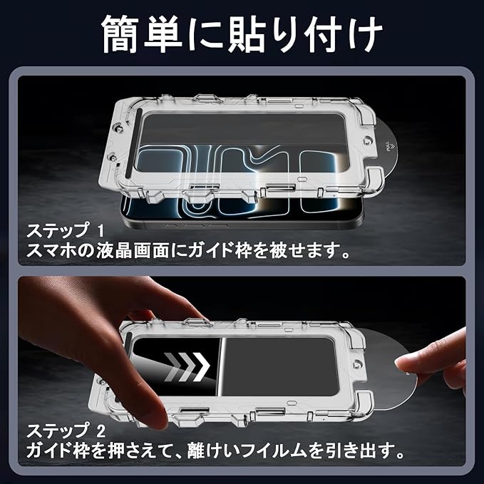 【簡単貼り付け・ガイド枠付き】専用の一体型ガイド枠は、貼付フィルムを非常に簡単にします。フィルムの自己吸着層により、位置を合わせて上から軽く置くだけで、簡単に貼り付けることができ、気泡が入り込まなりません。画面部分もエッジ部分もしっかりと貼ることができます。