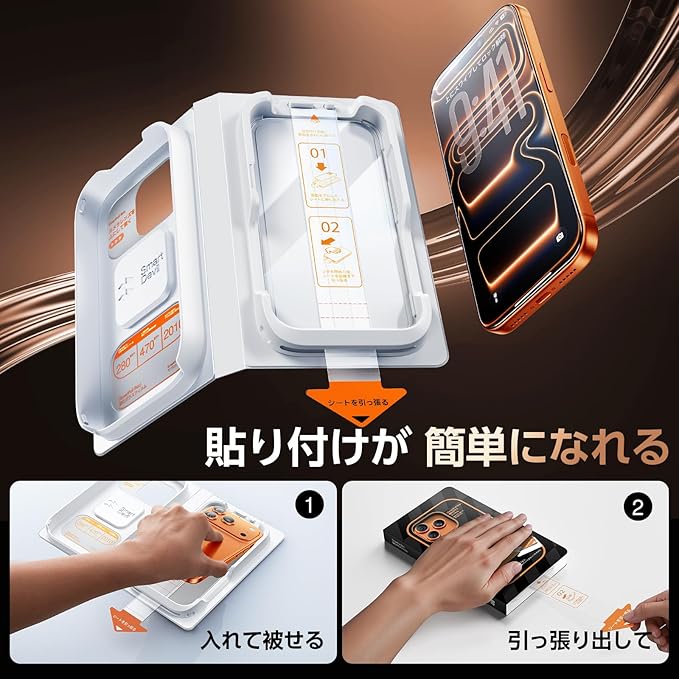 【新しい貼り付け体験】専用ボックス【SmartPull Box】の中にスマホを入れて、シートを引くだけで簡単に貼り付け可能です。