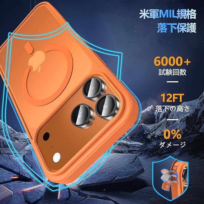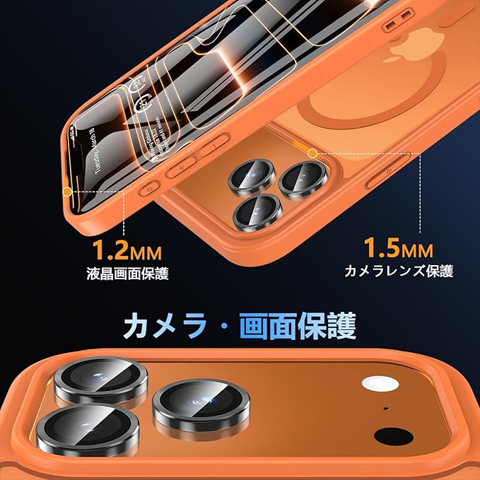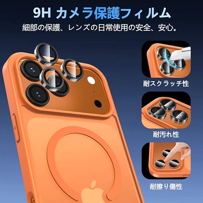 iPhone 17 Pro ケース [ガラスフィルム・カメラレンズカバー・MagSafe対応] いphone17pro ケース Hensinple 半透明 薄型 軽量 カメラ保護 全面保護 耐衝撃 アイフォン17プロカバー 指紋防止 マグネット搭載 マグセーフ対応 ストラップホール付き iPhone 17 Pro スマホケース 6.3インチ用 オレンジ