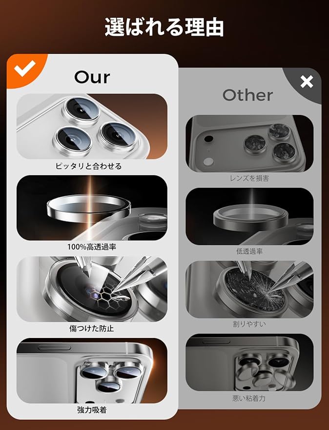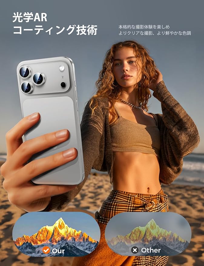 【高透過率99.9%】AR高透過技術を採用し、カメラ本来の高画質をキープ。黒縁を取ることにより、露出オーバーが防止でき、より綺麗な写真や動画を撮影することが可能。