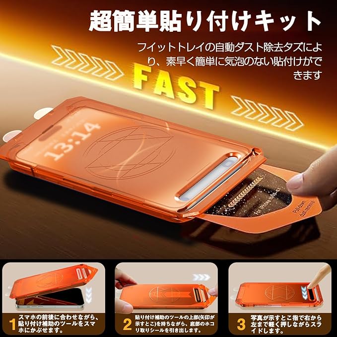 【貼り付け失敗はゼロ!新設計のガイド枠付き】初心者でも簡単に貼り付ける新設計ガイド枠が登場します!3つのステップだけ、超簡単に貼り付けできます!進化型ガイド枠でiPhoneの画面に被せて、ホコリ除去シートを引っ張ります!自分で貼ると歪み、気泡、ホコリ、浮きなどの問題が起こりやすい」という常識を打ち破り、素人でも100%完璧に貼り付けます
