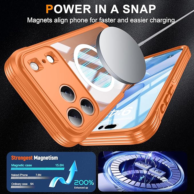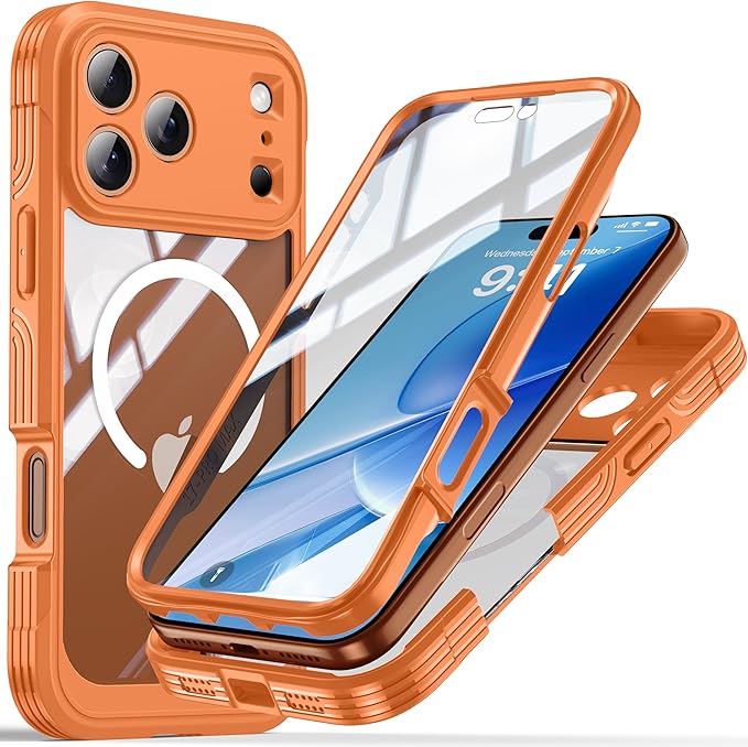iPhone 17 Pro 用ケース Magsafe対応 ガラスフィルム付き 前後 クリアカバー 液晶保護 フルカバー 全面保護 嵌め込み式 防塵 軽量 滑り止め 米軍MIL規格取得 耐衝撃 アウトドア、オレンジ