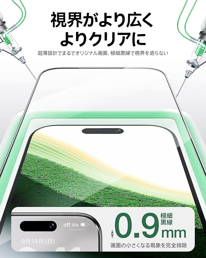 「極細黒縁・全面保護」3D曲面エッジ加工を採用したフルカバー設計で、端までぴったり貼れるため、縁割れの心配がありません。落下や衝撃による損傷からスマホをしっかり保護します。防塵メッシュがスピーカー部分をカバーするため、通話や音楽などの音量への影響を与えません。アイホン17プロのディスプレイベゼルよりもさらに極細フレームにより、画面の表示領域を最大化し、没入感のあるディスプレイ体験を実現します。