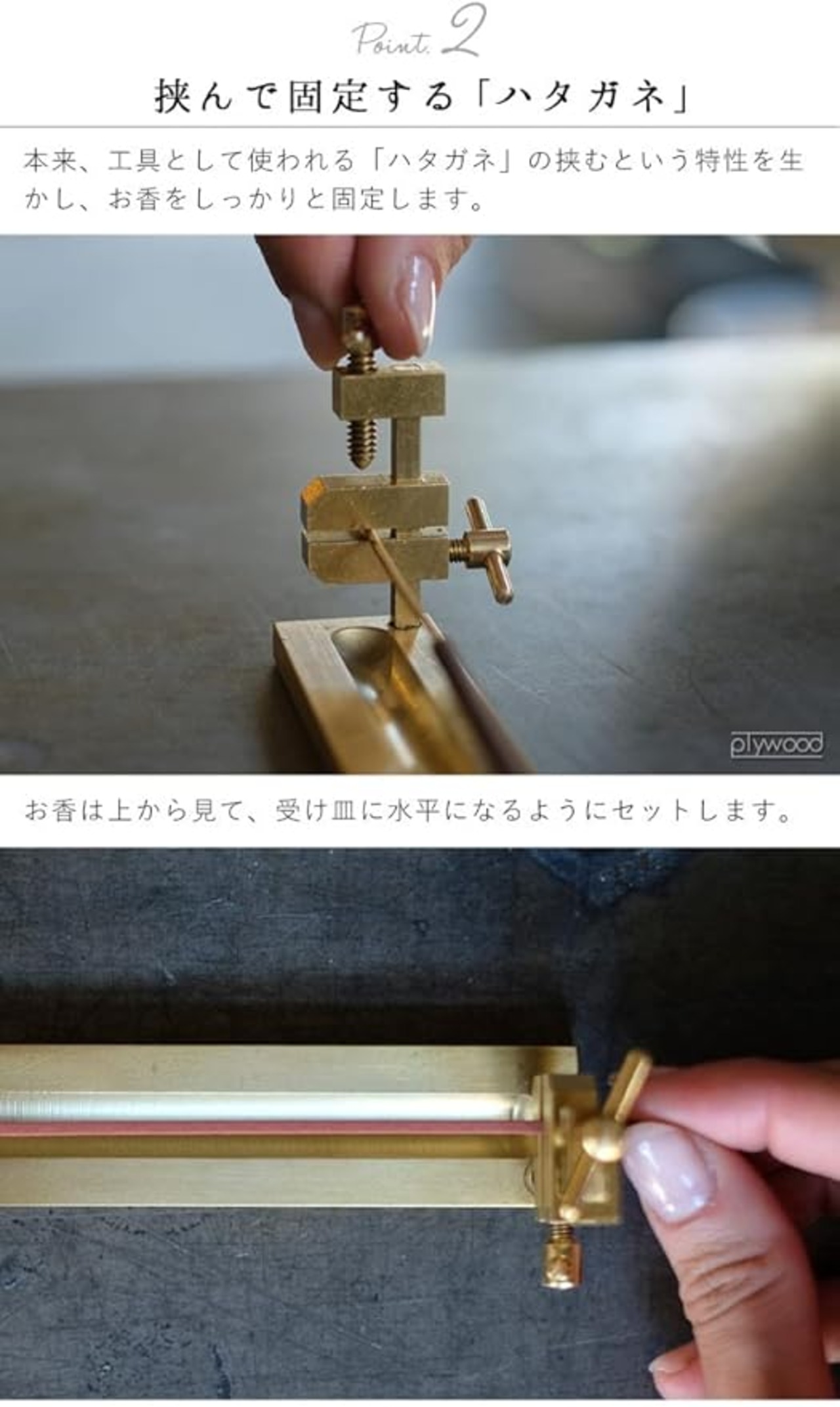 [ライフスタイルを華やかに]をテーマに、国内外の優れたインテリア雑貨の輸入やオリジナルデザインの開発などを行っているWEST VILLAGE TOKYOから真鍮のハタガネを使用したお香ホルダーのご紹介です。 ハタガネ(端金)とは木工作業において、材料を締め付けるために用いる大工道具のこと。日本では古くから、組み手の接着や天板の板はぎなどに使用されてきました。そんなハタガネをインテリアとして取り込み、真鍮の素材感や大工道具ならではの利便性を活かしたお香ホルダーです。真鍮は経年により特有の深みのある重厚なおもむきになるので、長い間変化をお楽しみいただくことができます。また、ハンドメイドで作られているので一つ一つに個性があるのも魅力です。 タイプは2種類。 お香を水平に取り付けることでお香の直線的な美しさが際立つ卓上型の「FLOCCUS(フロッカス)」と、テーブルや棚などに取り付けられる「STRATUS(ストラタス)」からお選びいただけます。