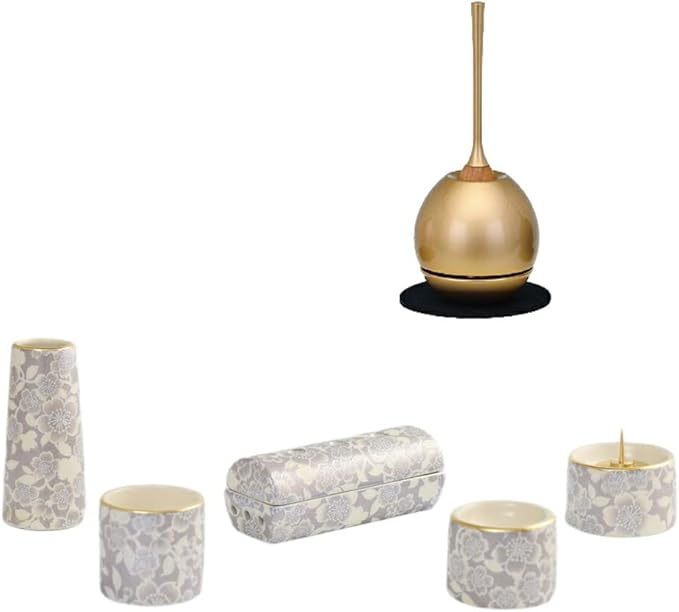 ■セット内容 <アイリス 筒型香炉> 〈仏器〉ご飯を入れていただくお皿が取り外すことが出来てお手入れも簡単で便利です。〈茶湯器〉 お水(またはお茶)をお供えしていただきます。お水を入れる部分が取り外すことが出来てお手入れも簡単で便利です。〈花立て〉お花をお供えしていただく仏具です。〈前香炉〉 お線香を焚いていただく仏具です。〈火立て〉ローソクを立てていただく仏具です。 (チェリンセット) チェリンと専用りん棒(先端部分はさくら材)、敷物(フェルト)のセットです。 チェリンは5種類の中からお好みの色をお選びいただけます。