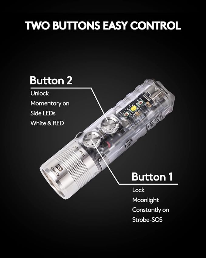 デュアルボタンで簡単操作:デュアルメタルボタンを搭載し、シンプルなユーザーインターフェースを実現します。 1 つ目はメインライトとロック機能を制御し、もう 1 つはサイドライト、モメンタリー オン モード、ロック解除を制御します。 それぞれが独自の役割を果たします