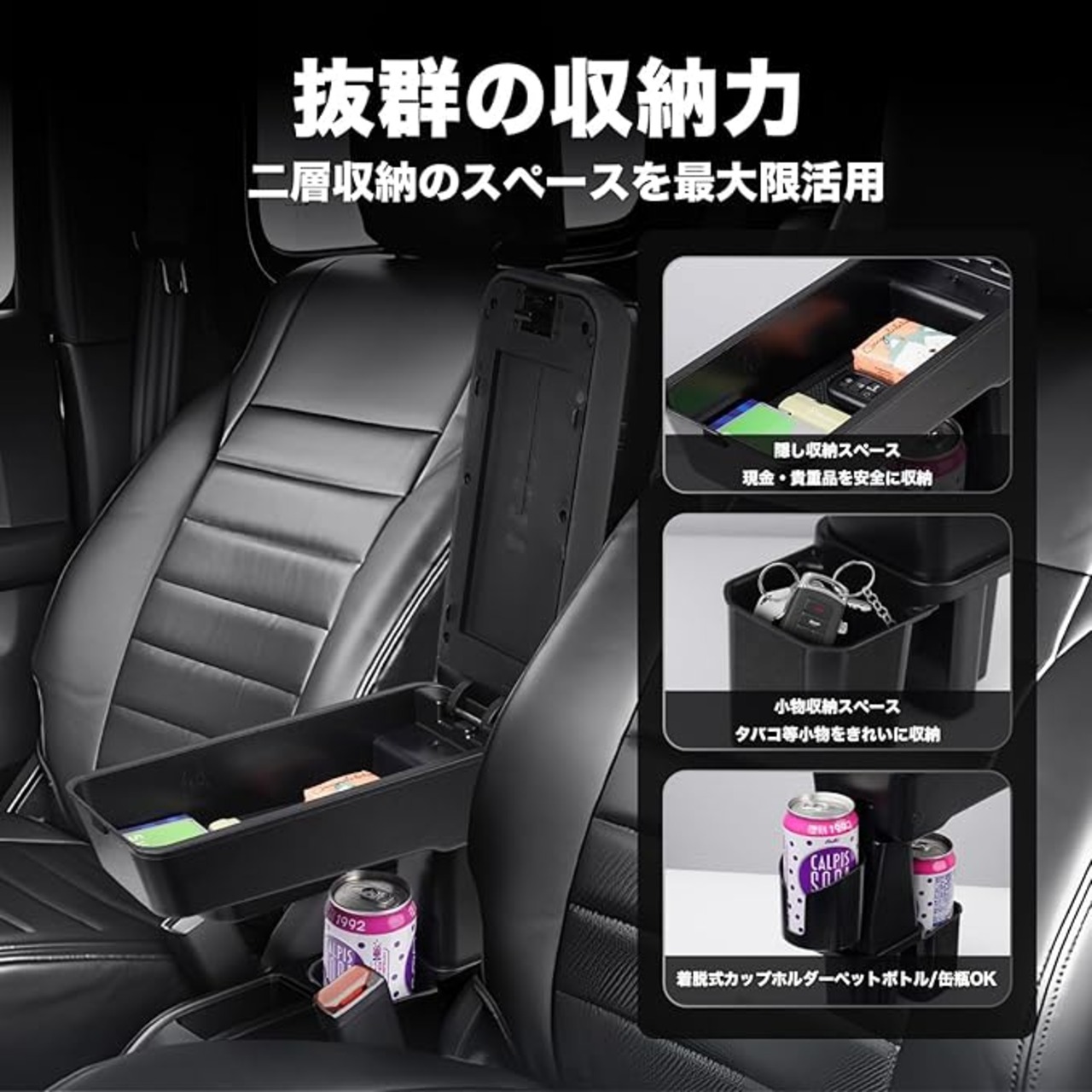 3.【収納スペースUP&ドリンクホルダー付き】ジムニーJB64/JB74専用アームレストは、600mlペットボトルや400ml缶も収納可能な便利なドリンクラックを搭載。車内の収納スペースを有効活用でき、整理整頓がしやすい多機能デザインで、日常使いからアウトドアまで大活躍します。
