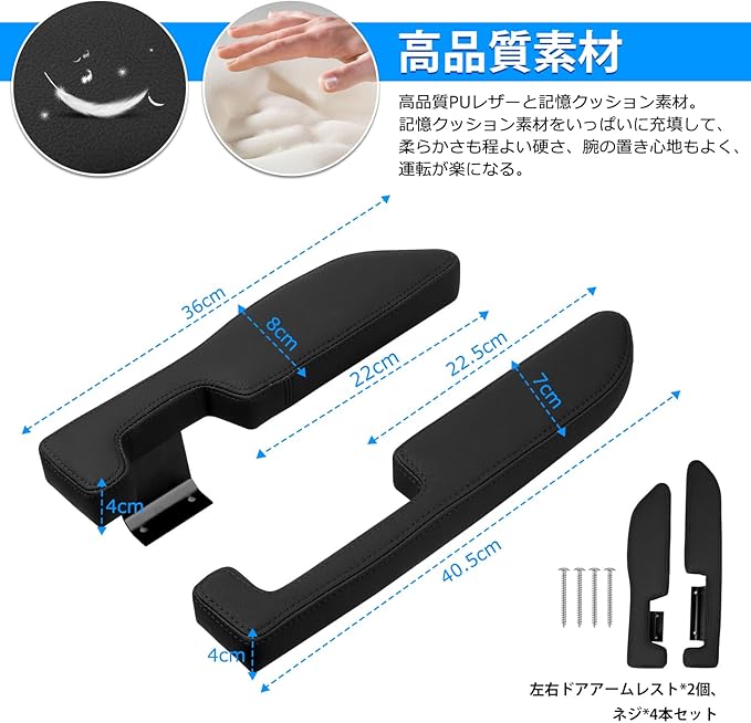 2.【商品内容&高品質素材】:ドアアームレスト本体*2p(左右セット)、ネジ*4本。高品質マイクロファイバーと記憶クッション素材。記憶クッション素材をいっぱいに充填して、柔らかさも程よい硬さで心地よく肘を置けます、腕の置き心地もよく、運転が楽になリます。