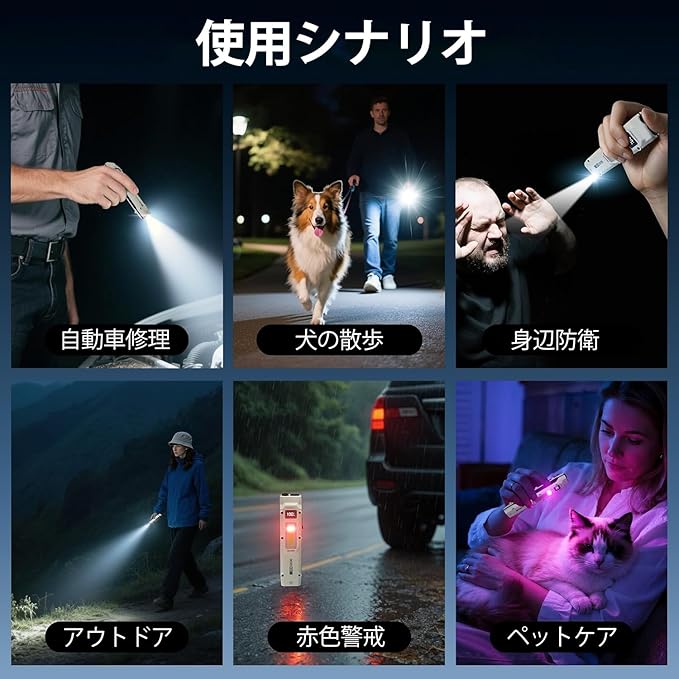 【2025新規 超高輝度LED・COB懐中電灯】Aicdas B01 製品サイズ:13.3 3.3 2.5cm 重量:103g 超高輝度の LED ライトは寿命が 10 万時間以上に達し、周囲の暗闇を一掃。夜間でもまるで白昼のような照明効果を実現します。懐中電灯の正面には、COB 白色灯、赤色灯、さらに紫外線ライトの機能が追加設計されています。突然の停電時には子供の学習用ライトとして使用可能で、家庭での宿題や筆記作業にも便利です。また、紫外線機能により、肉眼では発見しにくい汚れを検出することができます。さらにストラップを付属しており、アウトドアなどの場合は手首に引っ掛けて持ち歩くこともできるので大変便利です。