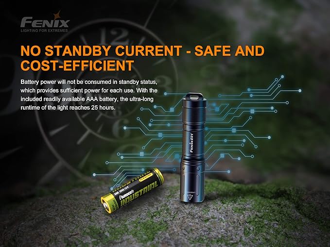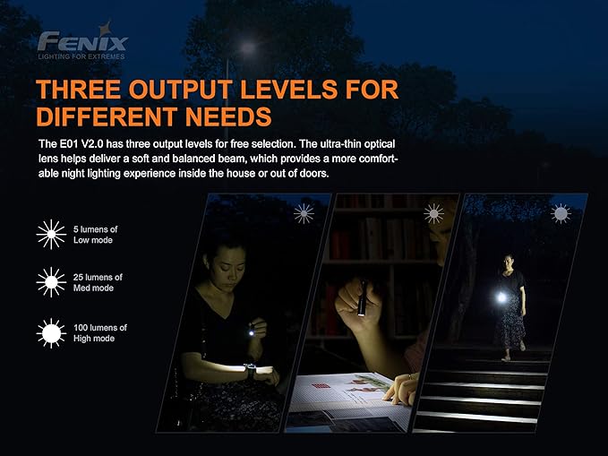 Fenix E01 V2.0 AAAフラッシュライトは、付属の単4電池1本で最大100ルーメンの明るさを放ちます。超薄型光学レンズを採用し、ソフトで均一なビームを最大距離35メートルまで届けます。ヘッドを素早くひねることで、3段階の明るさを簡単に切り替えられます。長さわずか66.5mm、直径15mmで、IP68規格の防塵・防水性能を備えた頑丈な設計です。非常に小型でコンパクトなこの標準単4電池フラッシュライトは、日常携帯に最適な選択肢です。