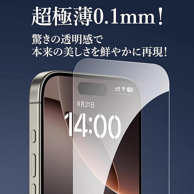 【0.1mm極薄型】業界初の0.1mm極薄型強化ガラスフィルムをご紹介します。通常のガラスフィルムの1/3の薄さを実現し、カメラやセンサーの穴、端の周りも目立たず、小さなゴミやほこりが溜まりにくく、常に清潔な状態を保ちます。極限まで薄さと軽さを追求し、使いやすさにこだわった結果、何も貼っていないかのような一体感を実現。さらに、タッチ感度の向上も可能になりました。
