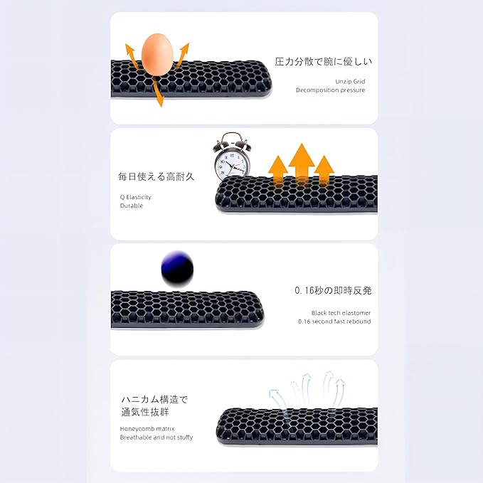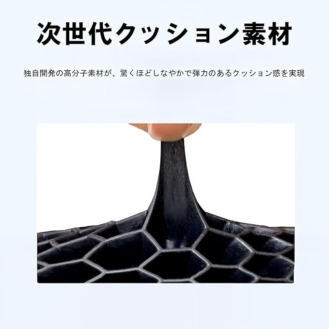 【素材】柔らかくて弾力のある高反発ジェル素材を使用。ゴムのようなしなやかさと耐久性があり、長時間使用してもへたりにくく、肌にもやさしい設計です。通気性に優れたハニカム構造で、ムレにくく快適です。