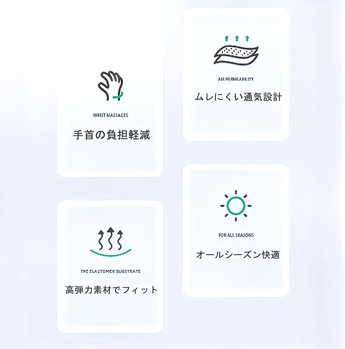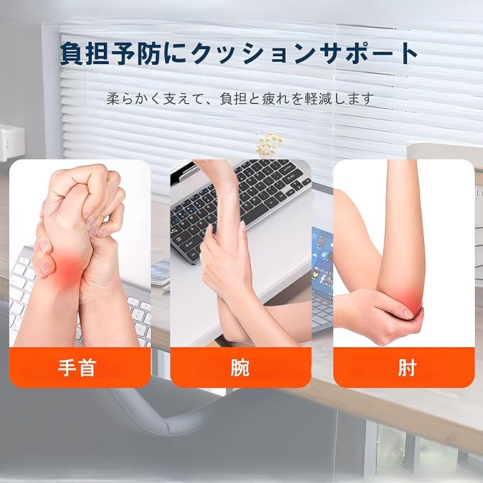 【機能】手首から肘までをしっかり支えて、パソコン作業による疲れや負担を軽減します。高反発のジェル素材が圧力を分散し、長時間の使用でも快適な使い心地をキープ。通気性の高い構造でムレにくく、自然な手首の角度を保つことで、正しい姿勢をサポートします。